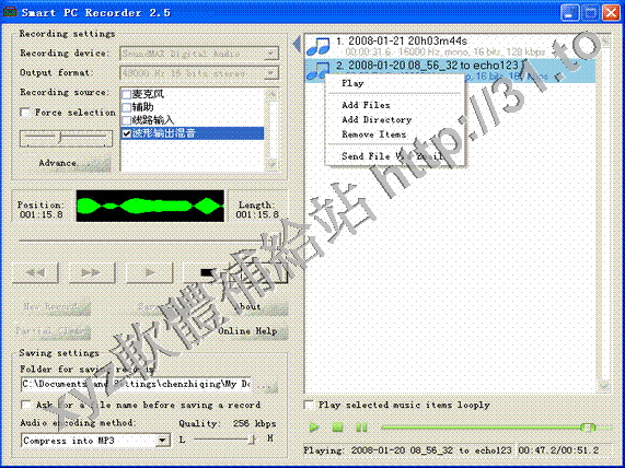 製成MP3或WAV文件。聲音來源可以是麥克風、線路輸入、電話輸入、磁帶機、錄影機、以